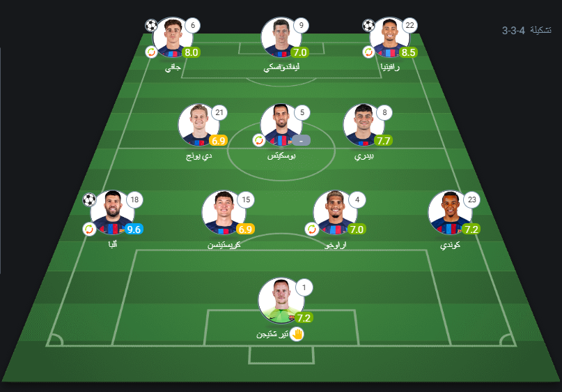 خط الهجوم: رافينيا 8.5، ليفاندوفسكي 7.0، جافي 7.8.