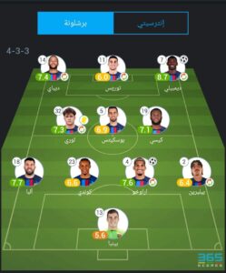 بالدي 6.5 – ماركوس ألونسو 6.3 – أنسو فاتي 8.6 – رافينيا 8.8 – إريك جارسيا 6.8 – جافي 7.2