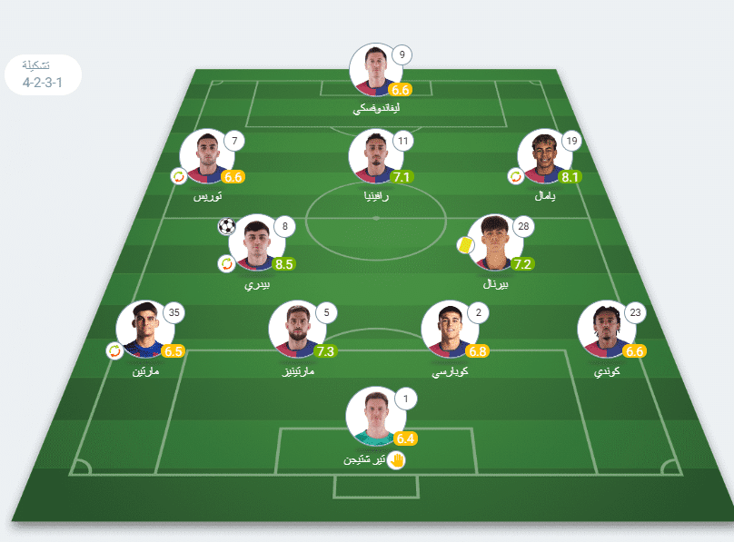 خط الوسط الهجومي: لامين يامال 8.1، رافينيا 7.1، فيران توريس 6.6.