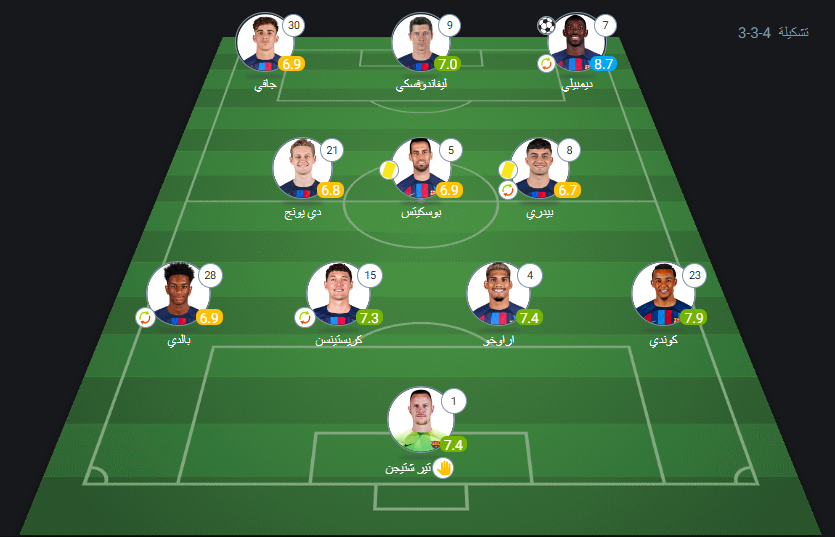 خط الهجوم: جافي 6.9، ليفاندوفسكي 7.0، عثمان ديمبيلي 8.7.