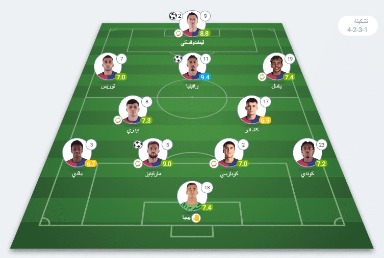 خط الهجوم: لامين يامال 7.4، روبرت ليفاندوفسكي 8.8، رافينيا دياز 9.4.