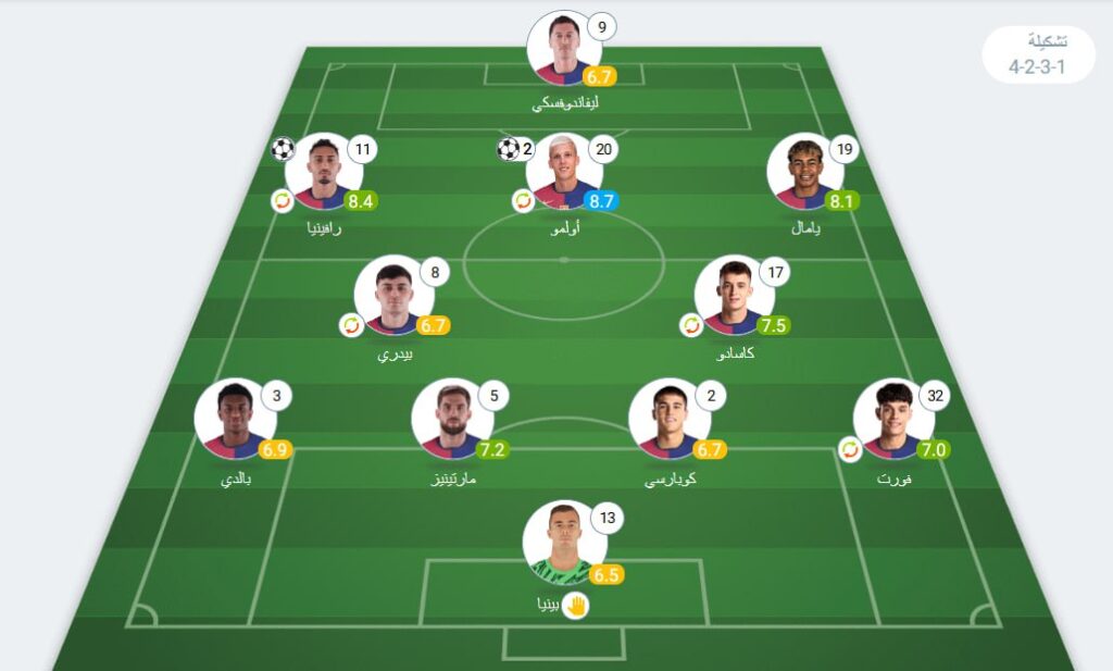 خط الهجوم: لامين يامال (8.1) – روبرت ليفاندوفسكي (6.7) – رافينيا (8.4).