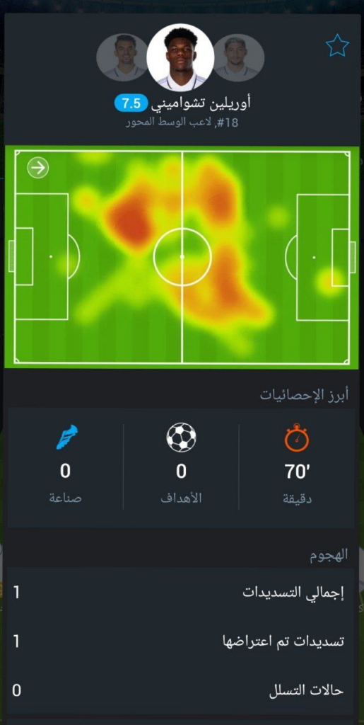 وحصل أوريلين تشواميني على أعلى نسبة تقييم بين لاعبي الفريقين بقيمة 7.5 رغم خسارة ريال مدريد بعدما صنع فرصة محققة للتهديف ووصلت دقة تمريراته إلى 97%.