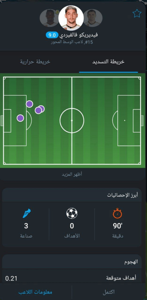 خط الوسط: توني كروس 6.7، كامافينجا 6.3، فيديريكو فالفيردي 9، إبراهيم دياز 7.8.