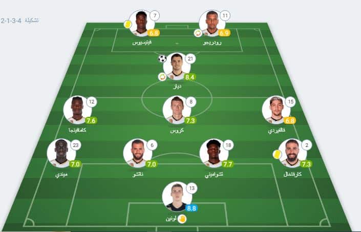 خط الهجوم: إبراهيم دياز (8.4)، رودريجو (6.9)، فينيسيوس جونيور (6.8)