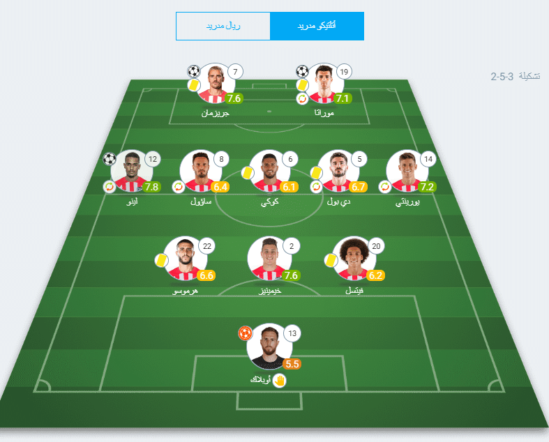 خط الوسط: يورينتي 7.2 – دي بول 6.7 – كوكي 6.1 – ساؤول 6.4 – لينو 7.8