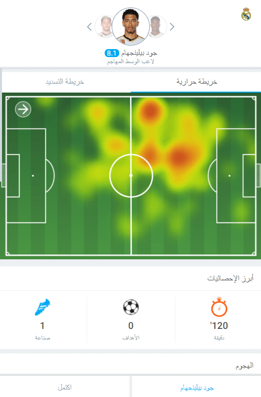 النجم الإنجليزي الشاب نجح في صناعة هدف من هفي النادي الملكي ، كما أنه ساعد زملائه في السيطرة على خط وسط الفريق في المباراة، كما أنه قدم 77 تمريرة صحيحة من أصل 87 بمعدل نجاح وصل إلى 89% خلال 120 دقيقة لعب.