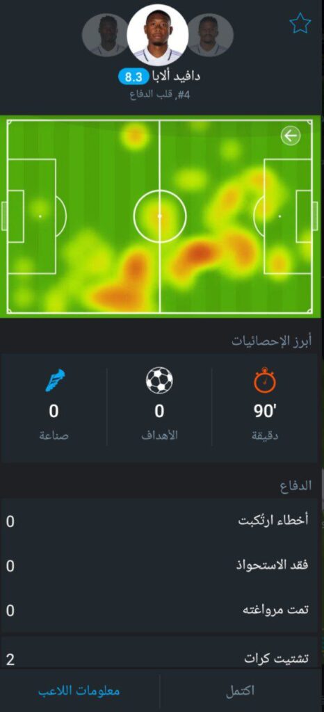 ألابا نجح في مساعدة زملائه في الخط الدفاعي في الحفاظ على شباك فريقه نظيفة في المباراة، بالإضافة إلى أنه قدم 52 تمريرة صحيحة من أصل 58، بمعدل نجاح وصل إلى 90%.