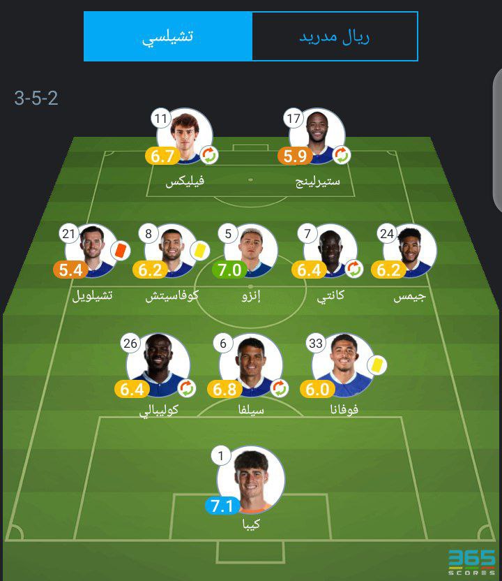 خط الوسط: ريس جيمس 6.2 – كانتي 6.4 – إنزو 7 – كوفاسيتش 6.2 – تشيلويل 5.4