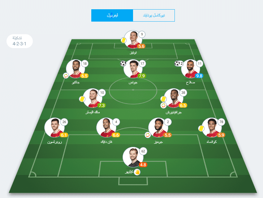 خط الهجوم: محمد صلاح 9.8، داروين نونيز 5.6، كودي جاكبو 6.5.