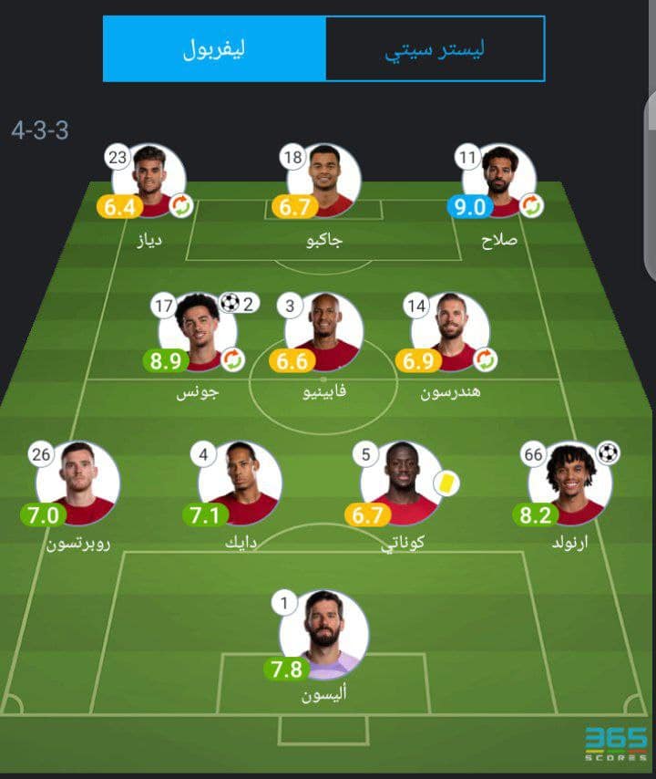 خط الهجوم: صلاح 9 – جاكبو 6.7 – لويس دياز 6.4