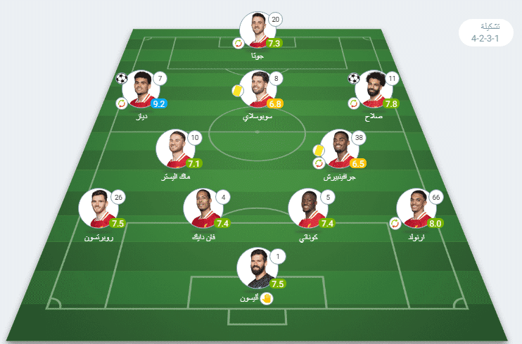 خط الهجوم: محمد صلاح “7.8” – ديوجو جوتا “7.3” – لويس دياز “9.2”.