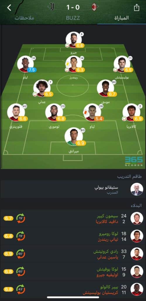 خط الدفاع: كالابريا 6.9 – مالك ثياو 5.4 – توموري 6.8 – فلورينزي 6.6