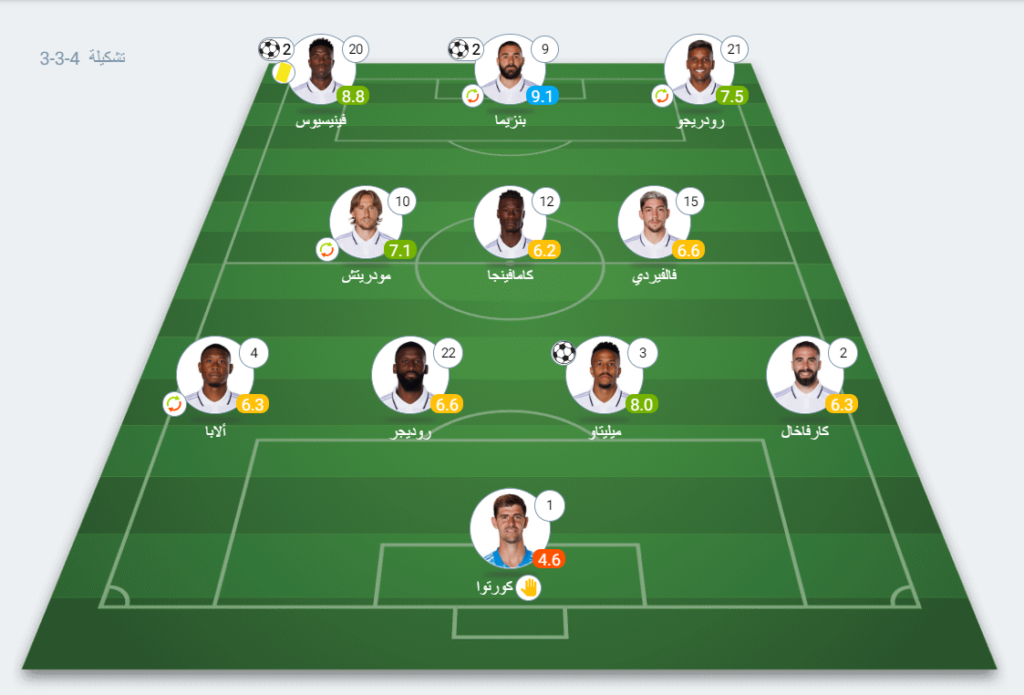 خط الهجوم: رودريجو (7.5)، كريم بنزيما (9.1)، فينيسيوس (8.8).