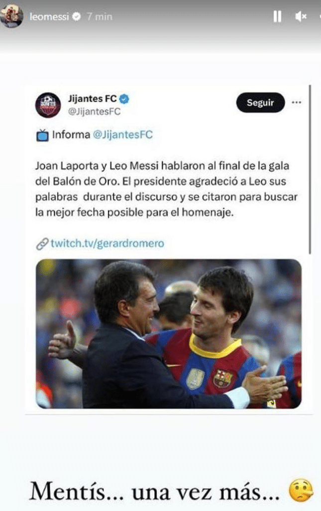 ونشر الصحفي، جيرارد روميرو عبر حسابه في “Jijantes FC”، أن خوان لابورتا وليو ميسي تحدثا في نهاية حفل الكرة الذهبية، وقام الرئيس لابورتا بشكر ليو على كلماته خلال الخطاب واجتمعوا لتحديد أفضل موعد ممكن لإقامة تكريم لميسي.