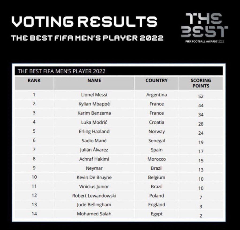 كشف الاتحاد الدولي لكرة القدم “فيفا” عن كافة مراكز الأفضل في العالم 2022، بعد نهاية حفل توزيع جوائز ذا بيست للأفضل هذا العام.