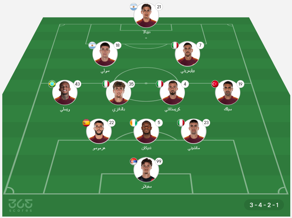 - خط الهجوم: لورينزو بيليجريني، باولو ديبالا، ماتياس سولي.