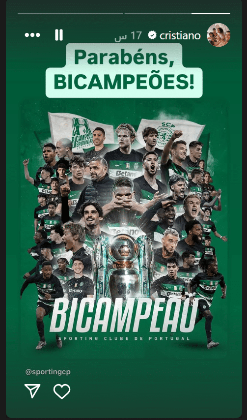 ونشر رونالدو صورة عبر حسابه الرسمي على منصة “إنستغرام” تُظهر لحظة تتويج سبورتنج، وعلّق عليها برسالة مختصرة قال فيها: “مبارك للأبطال”، في خطوة لاقت تفاعلًا واسعًا من جماهير النادي البرتغالي.