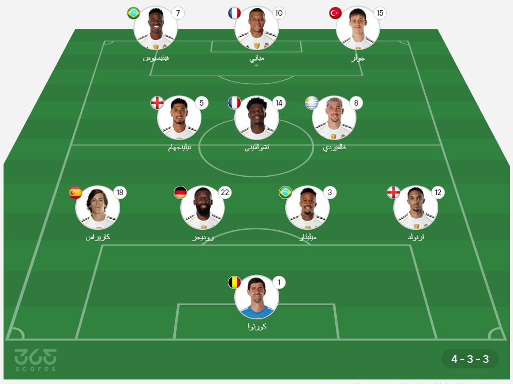 - خط الهجوم: فينيسيوس جونيور، كيليان مبابي، أردا جولر.