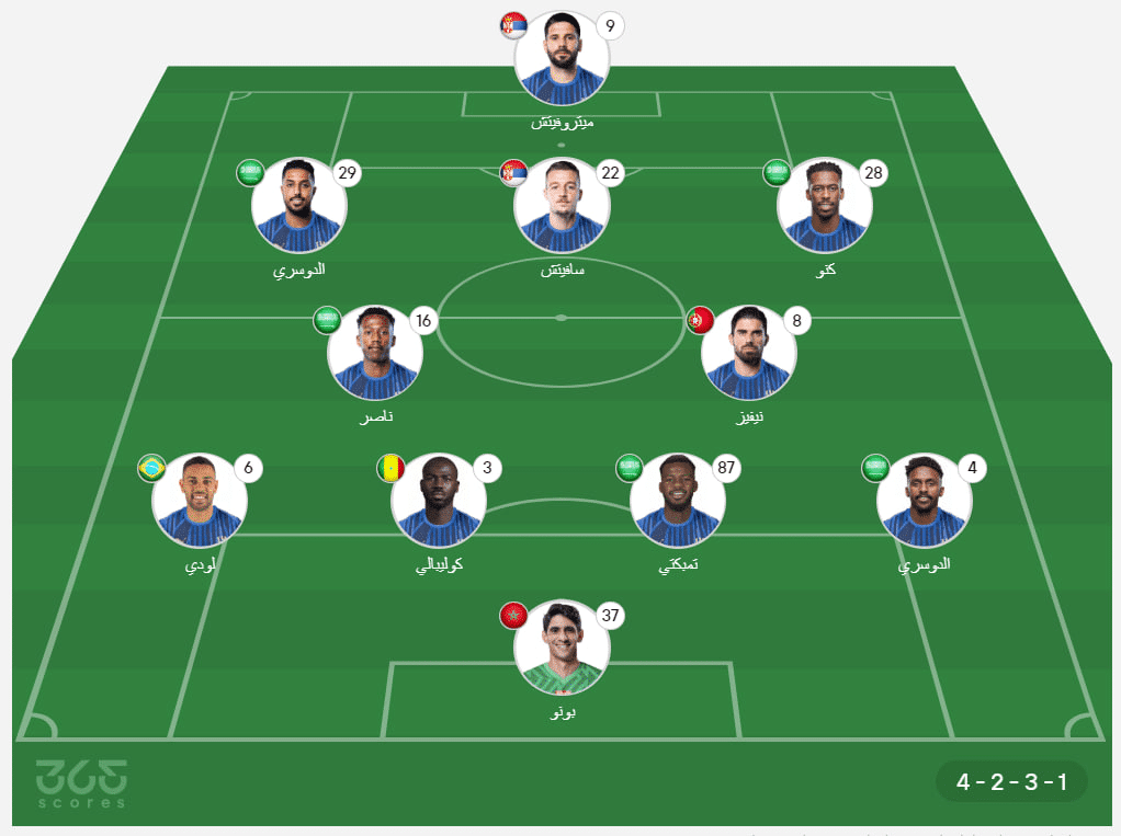 - خط الوسط الدفاعي: روبن نيفيز، ناصر الدوسري.