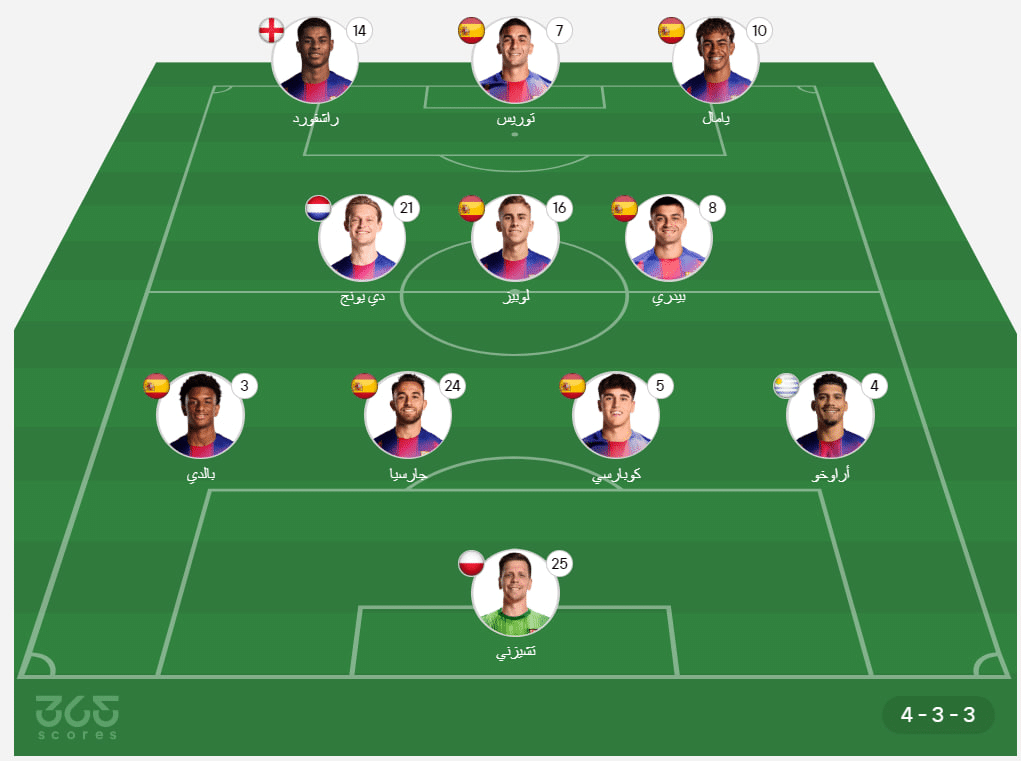- خط الهجوم: لامين يامال، فيران توريس، ماركوس راشفورد.