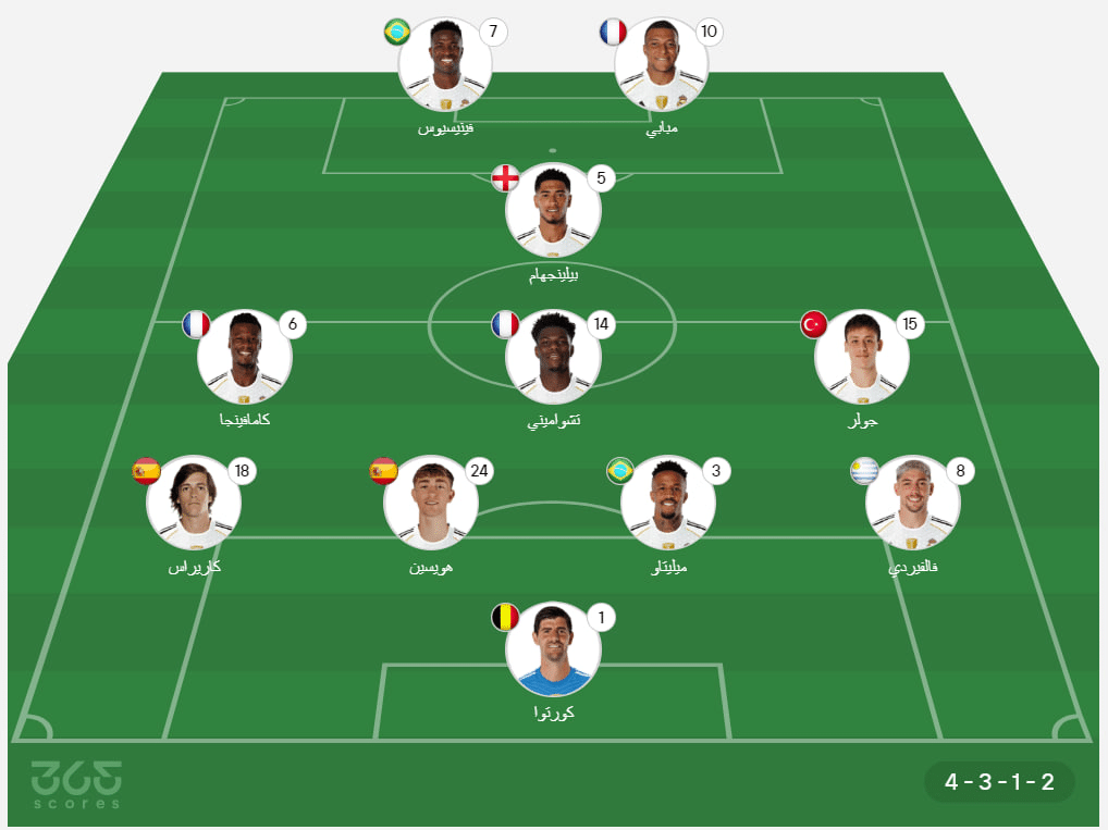 - خط الوسط: أردا جولر، أوريلين تشواميني، إدواردو كامافينجا، جود بيلينجهام.