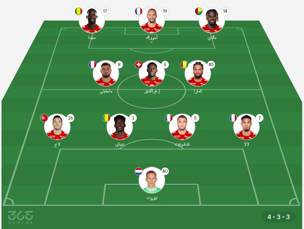 - خط الوسط: مهدي كمارا، إديميلسون فيرنانديز، هوجو ماجنيتي.