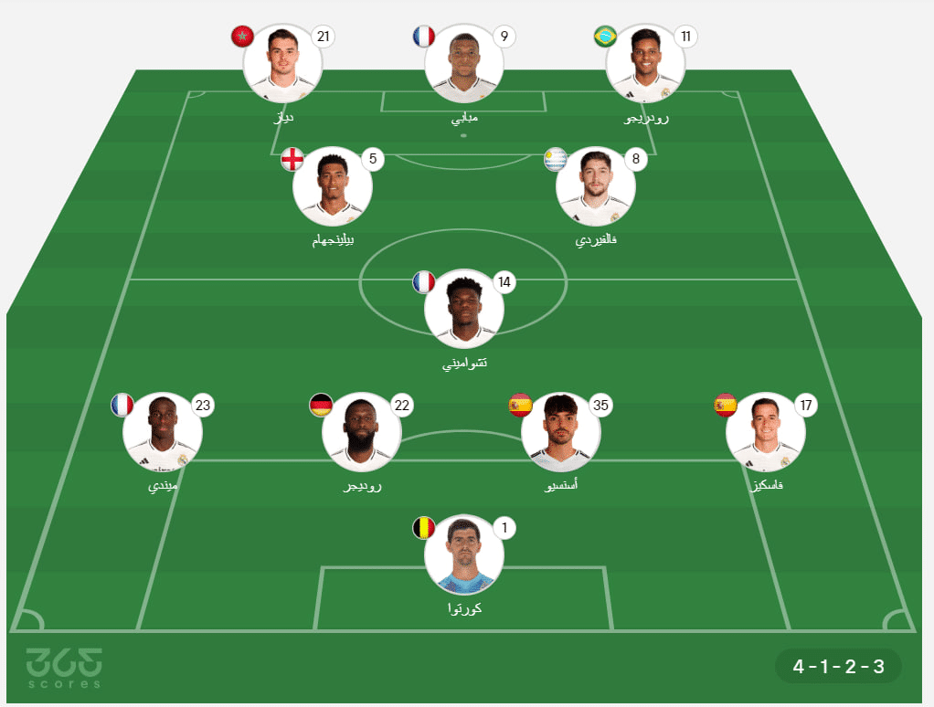 - خط الوسط: أوريلين تشواميني، فيديريكو فالفيردي، جود بيلينجهام.