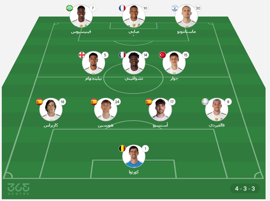 - خط الهجوم: فينيسيوس جونيور، كيليان مبابي، فرانكو ماستانتونو.