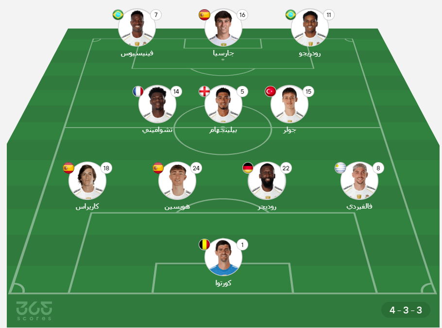 - خط الوسط: أردا جولر، جود بيلينجهام، أوريلين تشواميني.