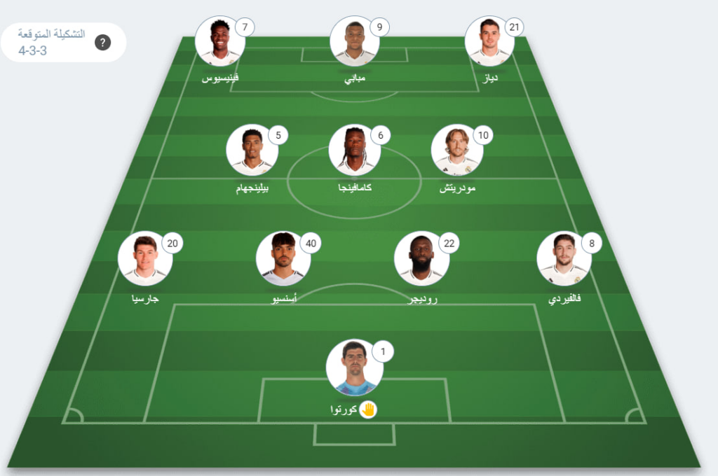 - خط الهجوم: إبراهيم دياز، كيليان مبابي، فينيسيوس جونيور.