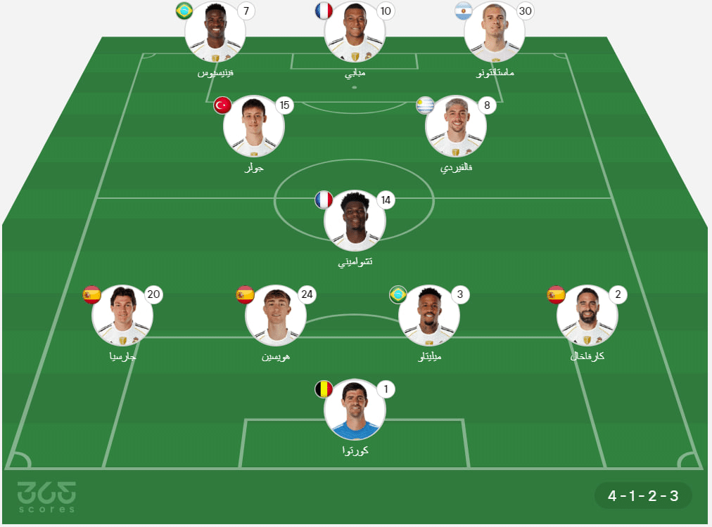 - خط الهجوم: فينيسيوس جونيور، كيليان مبابي، فرانكو ماستانتونو.