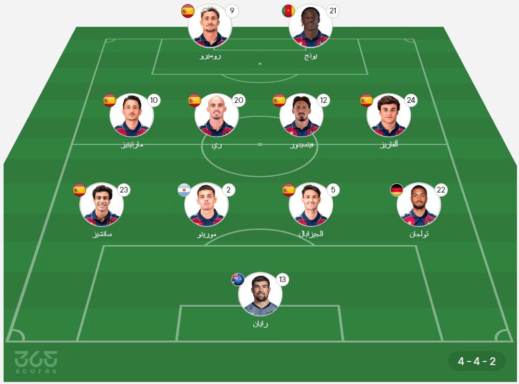- خط الدفاع: مانو سانشيز، ماتياس مورينو، أوناي الجيزابال، جيريمي تولجان.