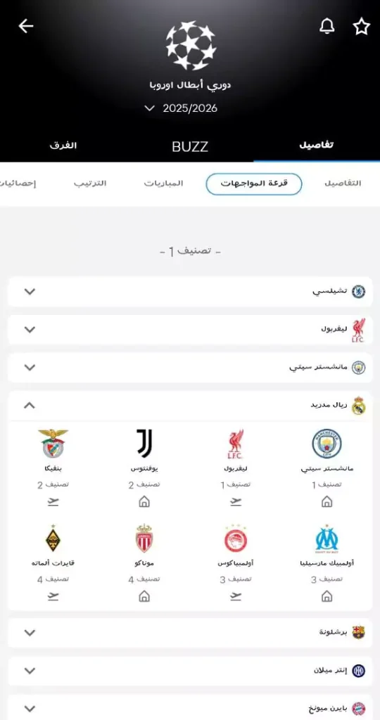بمجرد الدخول إلى التطبيق، تذهب إلى مربع (البحث) ثم تقوم بالبحث عن مسابقة دوري أبطال أوروبا ثم في عند التبويب الخاص بـ(قرعة المواجهات) بمجرد الضغط عليها سيظهر لك التصفينات الأربعة لمرحلة الدوري من دوري أبطال أوروبا والمحددة رسميًا من قبل الاتحاد الأوروبي لكرة القدم “يويفا”.