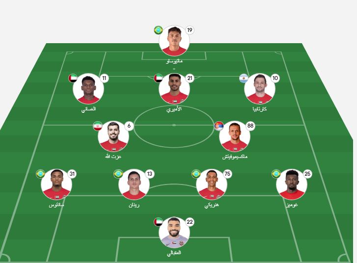 - خط الوسط الهجومي: فيدريكو كارتابيا – سلطان عادل الأميري – يحيى الغساني.