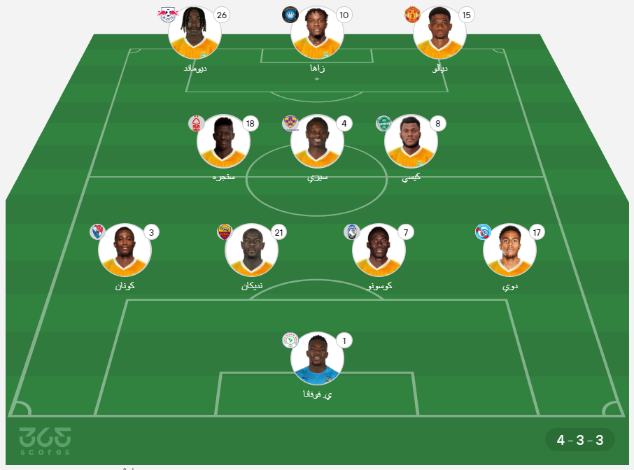 - خط الهجوم: يان ديوماند، ويلفريد زاها، أماد تراوري.