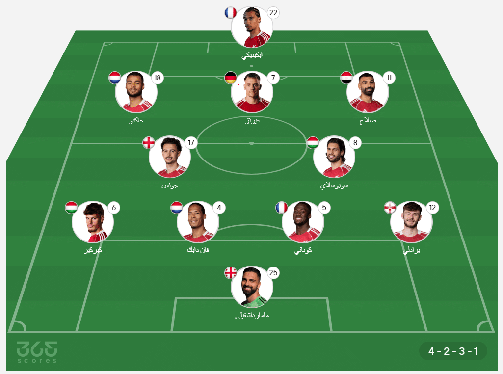 - خط الوسط الهجومي: كودي جاكبو، فلوريان فيرتز، محمد صلاح.