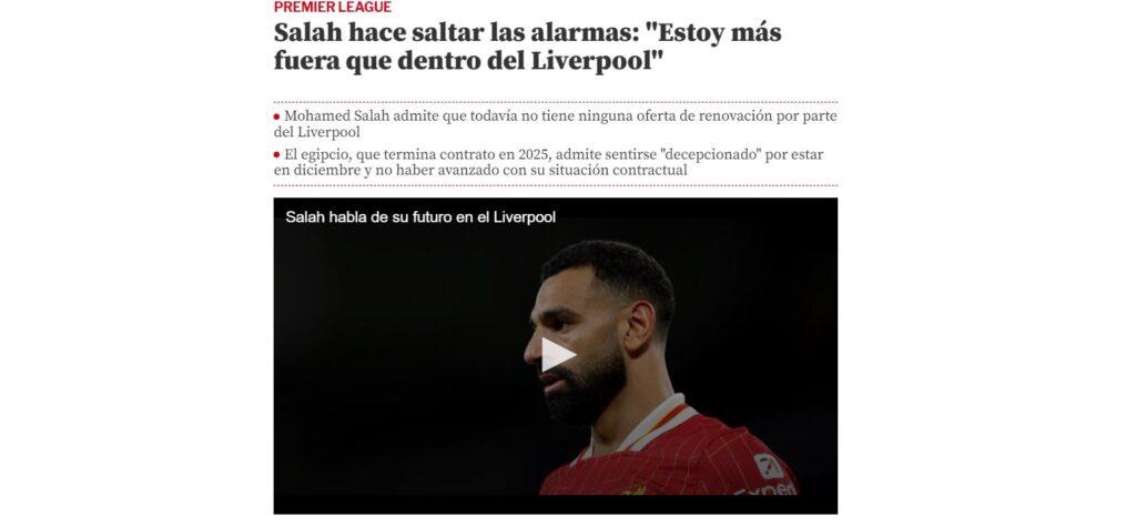 ومن جهتها، عنونت صحيفة “موندو ديبورتيفو” الكتالونية بعنوان:”صلاح يدق أجراس الإنذار: “أنا خارج ليفربول أكثر من داخله””.