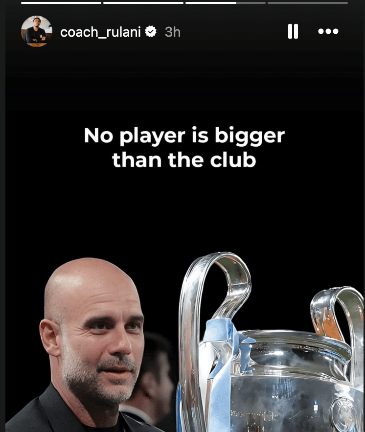 فيما نشر رولاني موكوينا صورة للمدرب الإسباني بيب جوارديولا، مرفوقًا بتصريحه الذي قال فيه: “لا يوجد لاعب أكبر من الفريق”.