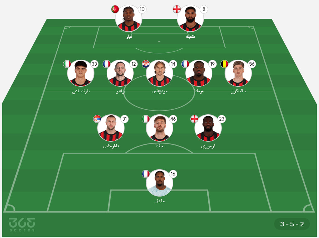 - خط الوسط: دافيد بارتيساجي، ادريان رابيو، لوكا مودريتش، يوسف فوفانا، أليكسيس سالماكرز.