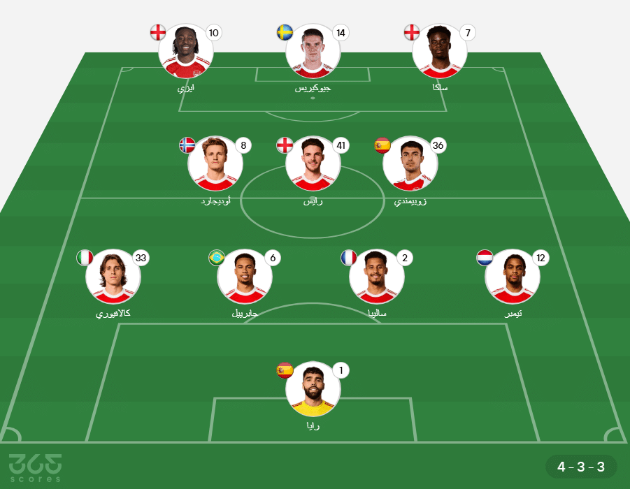 - خط الوسط: ديكلان رايس، مارتن أوديجارد، مارتن زوبيمندي.