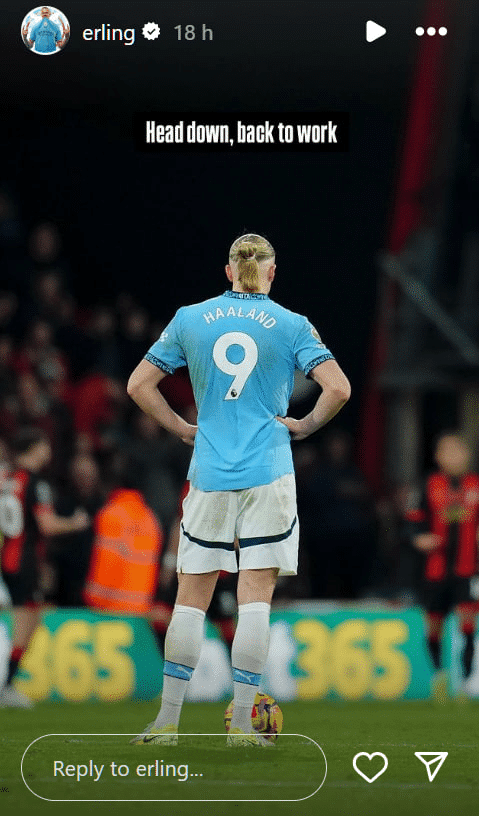 ومن خلال رسالة عبر حسابه الرسمي بموقع “إنستجرام”، قام هالاند بنشر صورة من المباراة وكتب باللغة الإنجليزية (head down, back to work).
