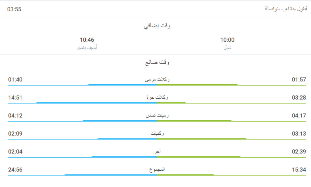 ورغم أن الوقت الإجمالي للمباراة كان 100 دقيقة و49 ثانية، إلا أن خاصية وقت اللعب الفعلي تُظهر أن إجمالي اللعب كان 59 دقيقة و30 ثانية فقط.