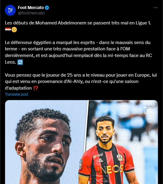 وكتب الحساب الخاص بموقع فوت ميركاتو الفرنسي على موقع التواصل الإجتماعي إكس :” كانت بدايات محمد عبد المنعم سيئة للغاية في الدوري الفرنسي الدرجة الأولى”.