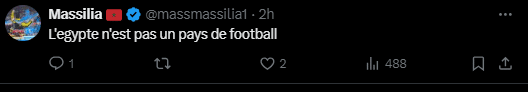 ورد أحد المتابعين على نفس التغريدة: “مصر ليست دولة كرة قدم” في إشارة إلى عدم تمتع اللاعب المصري بالموهبة الكافية.