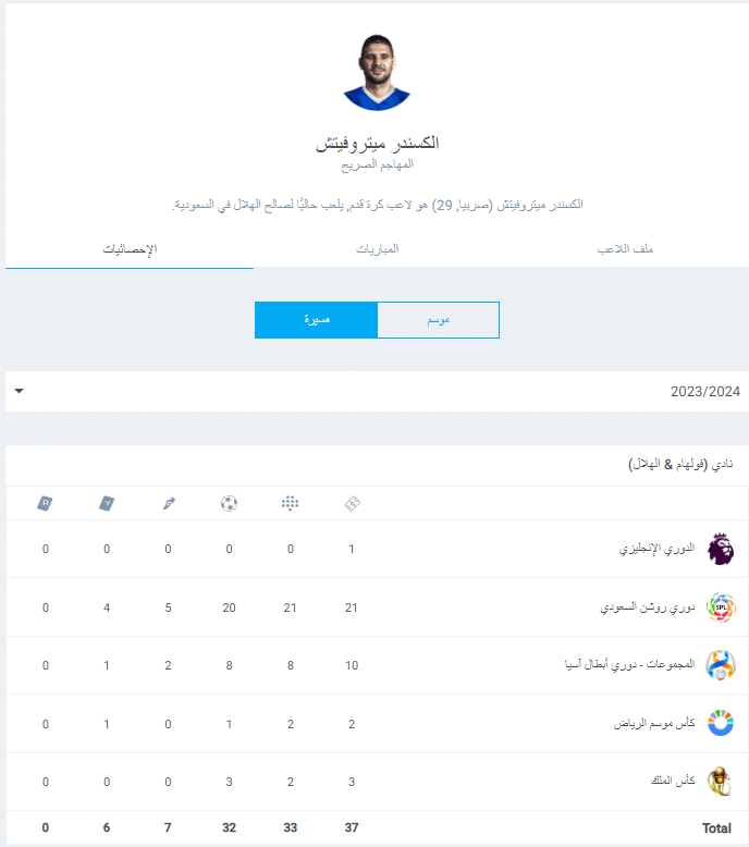 المهاجم البالغ من العمر 29 عامًا شارك مع الهلال في 37 مباراة هذا الموسم بمختلف المسابقات منهما مباراة واحدة بالدوري الإنجليزي قبل انتقاله للدوري السعودي، نجح خلالهم في تسجيل 32 هدفًا، وقدم 7 تمريرات حاسمة.