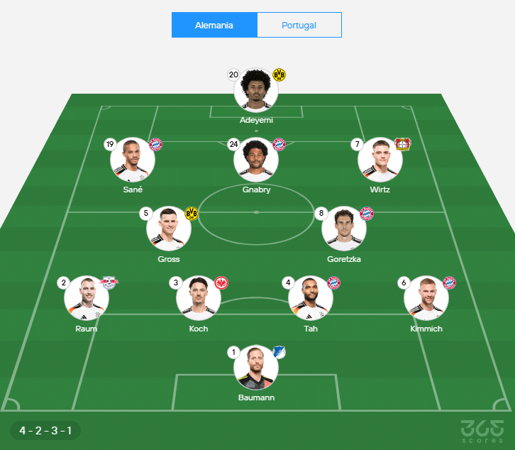 - Delanteros: Serge Gnabry, Leroy Sané, Karim Adeyemi.