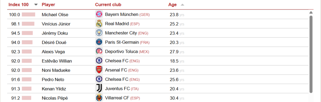 | 100.0 | Michael Olise | Bayern München (GER) | 23.8 yrs |