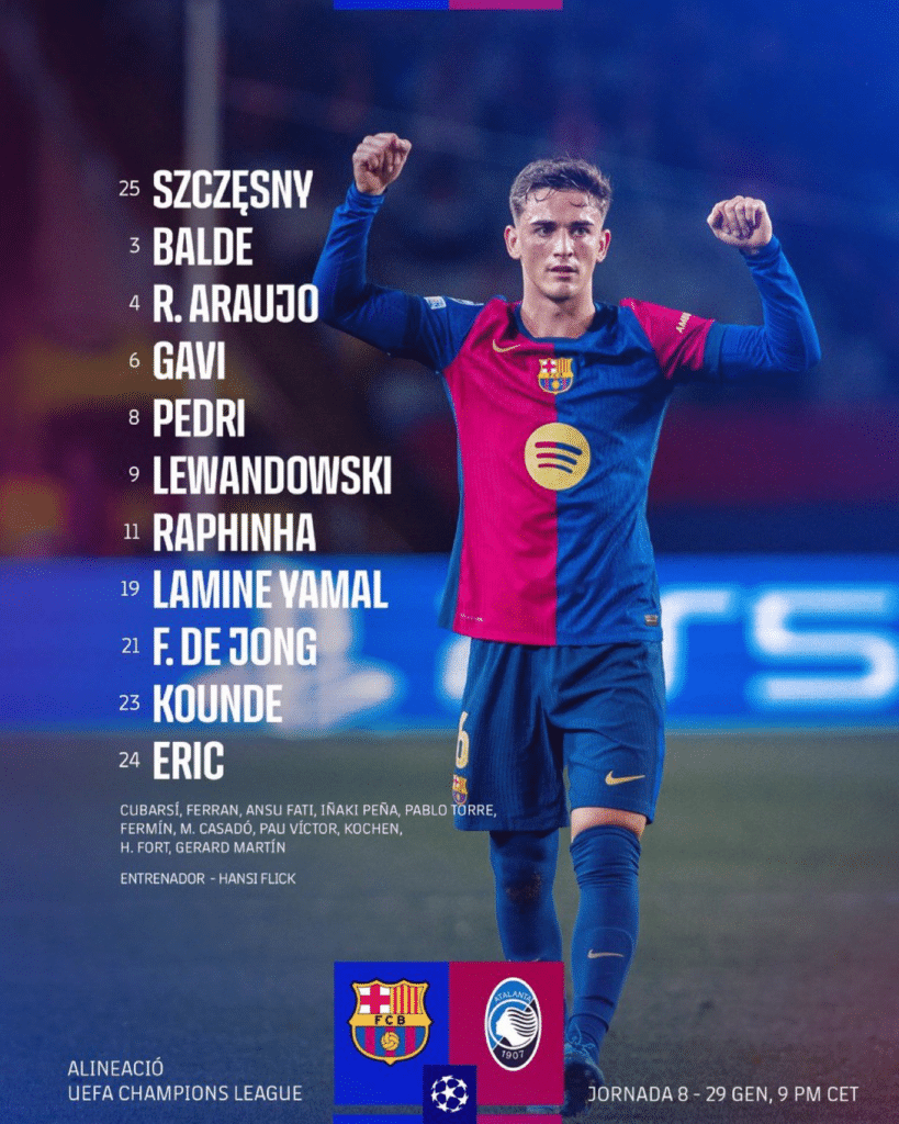 Está es la alineación titular escogida por Hansi Flick: Szczsney, Kounde, Araujo, Éric García, Balde, De Jong, Pedri, Gavi, Lamine Yamal, Raphinha y Lewandowski.