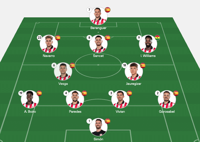 Jugadores no disponibles: Aymeric Laporte, Nico Williams, Beñat Prados, Unai Eguíluz